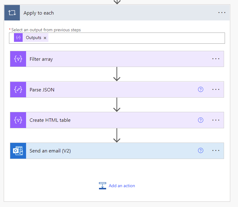 Loop Step#4 – The last step in the loop is to send the email. Use the same JSON that you used to filter the array in Loop Step#1, since that is the email address of the Project manager. Fill out the subject and Body of the email with whatever information you want, including the HTML table you just created.
