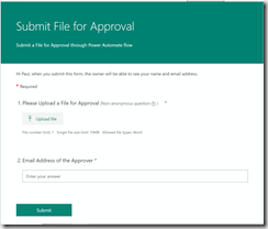 I was asked recently if it was possible to upload a file via a Microsoft Form and then use Power Automate Approvals to Approve the file. The answer of course is YES, but that doesn’t answer the question of HOW? So in this POST I will walk through a simple example showing how this can be done.